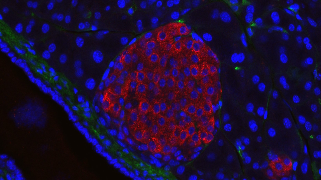 Клітини підшлункової миші, які виробляють інсулін (зафарбований червоним). Jakob Suckale / Solimena lab, Paul Langerhans Institute Dresden