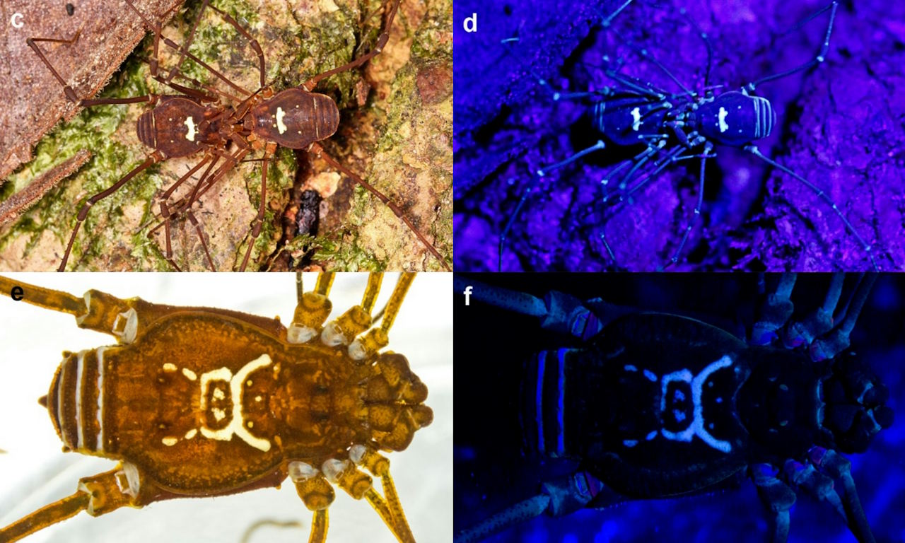 Узори на спині косариків під звичайним світлом та ультрафіолетом. Friedrich et al. / Scientific Reports, 2026