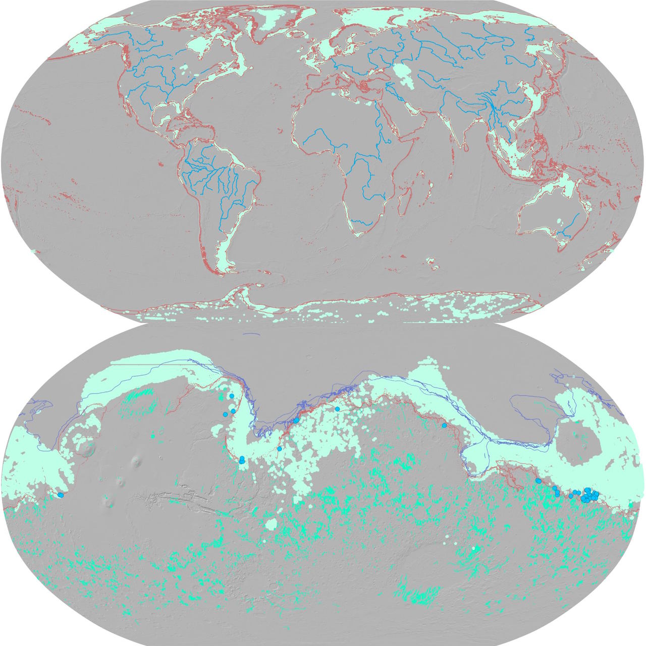Шельфові регіони на Землі та на Марсі (зафарбовані бірюзовим). Zaki & Lamb / Nature, 2026
