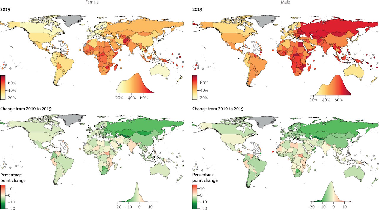 Верхній ряд — розподіл імовірності смерті від хронічних хвороб у віці до 80 років у жінок (зліва) і чоловіків (справа), темніший колір позначає більшу ймовірність. Нижній ряд — приріст або зменшення імовірності смерті від хронічних хвороб у жінок (зліва) і чоловіків (справа), відтінками зеленого позначене зменшення ймовірності, відтінками червоного — збільшення. Bennett et al. / Lancet, 2025