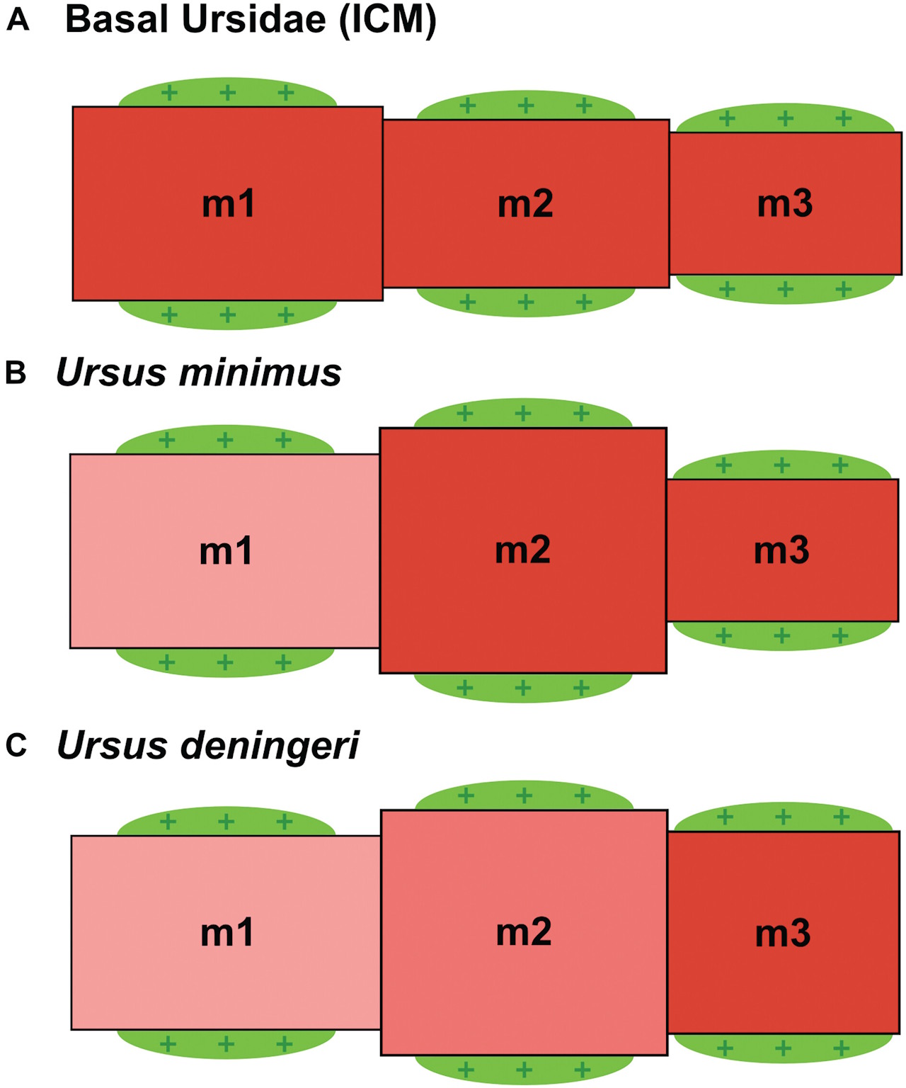 Як з’ясувалося, перша зміна в розмірах кутніх зубів у ведмедів сталася приблизно 3,6 мільйона років тому в малого ведмедя (Ursus minimus), якого вважають предком більшості сучасних видів. Через зміну клімату в Європі вологі тропічні ліси змінилися на ліси помірних широт і луки. Це ускладнило ведмедям полювання на дрібних тварин, що складали основу їх раціону, тож малі ведмеді перейшли на всеїдний раціон, що включав ягоди, комах і корені рослин, які необхідно було інтенсивніше жувати.