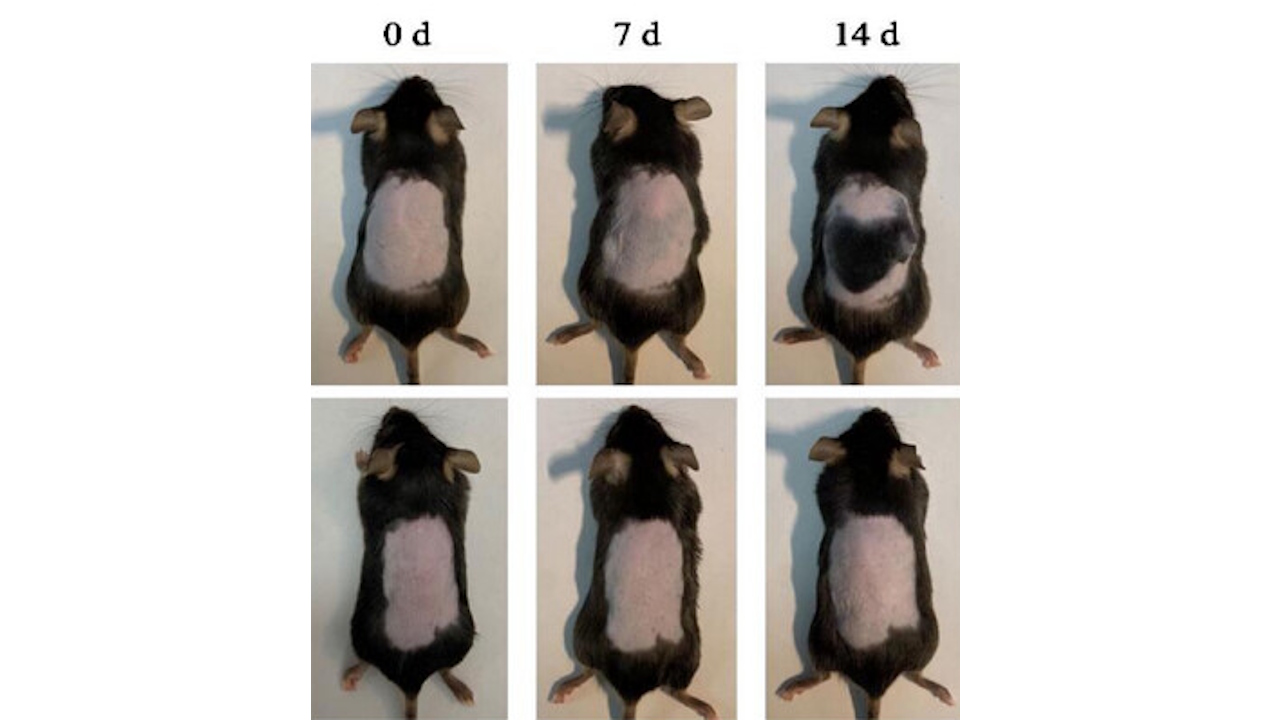 Ріст волосся в мишей з алопецією, яким нанесли міноксидил з екстрактом стевії (вгорі) чи не наносили нічого (внизу). Zhang et al. / Advanced Healthcare Materials, 2025