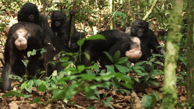 Самець бонобо (праворуч) спостерігає за самицею, в якої набрякли геніталії, що може вказувати на її готовність до спарювання. Heungjin Ryu