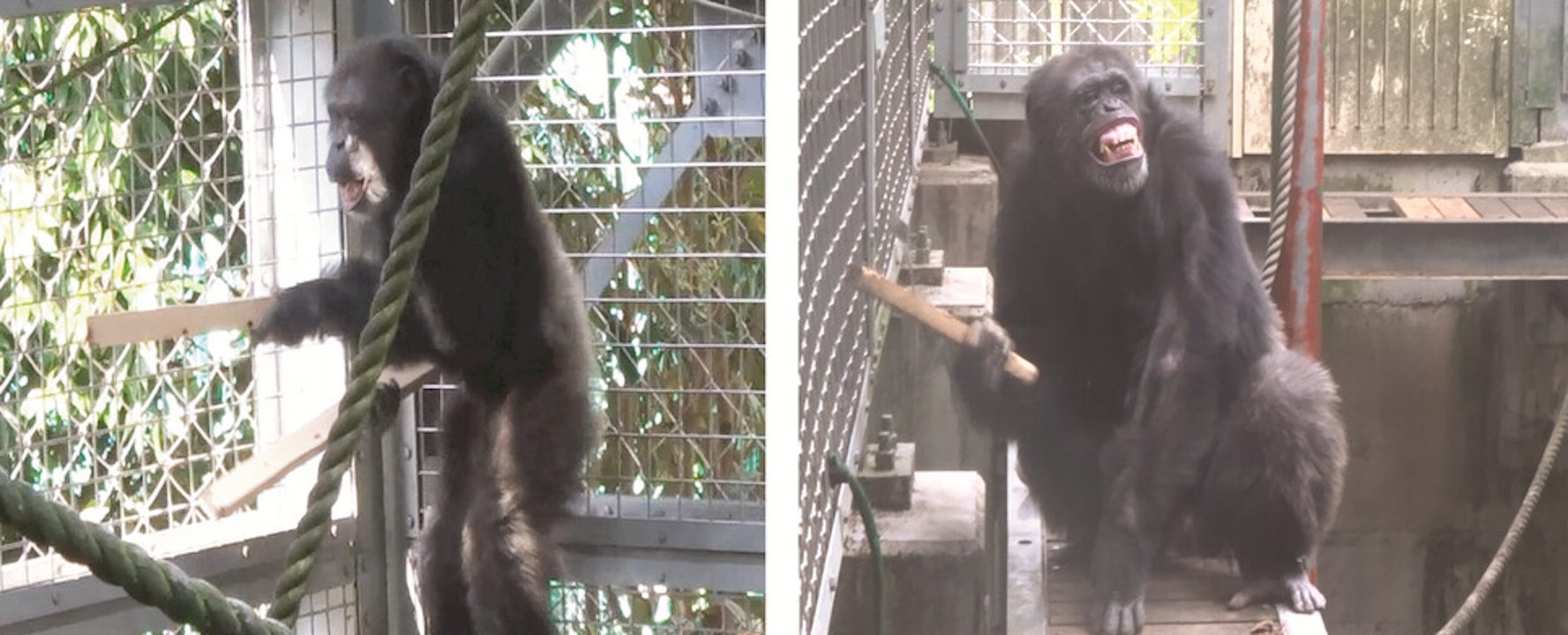 Під час того, як він барабанив інструментом по стінках вольєра, Аюму демонстрував два вирази обличчя: той, який шимпанзе використовують під час гри, і оголення зубів. Hattori et al. / Annals of the New York Academy of Sciences, 2026
