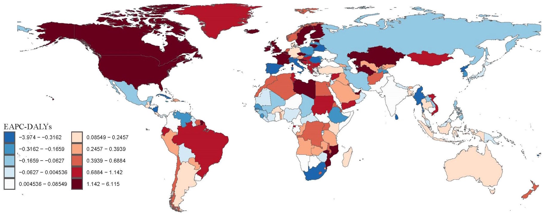Зростання (позначено відтінками червоного) або зниження (відтінками синього) частоти появи інвалідності внаслідок вживання наркотиків у світі.
