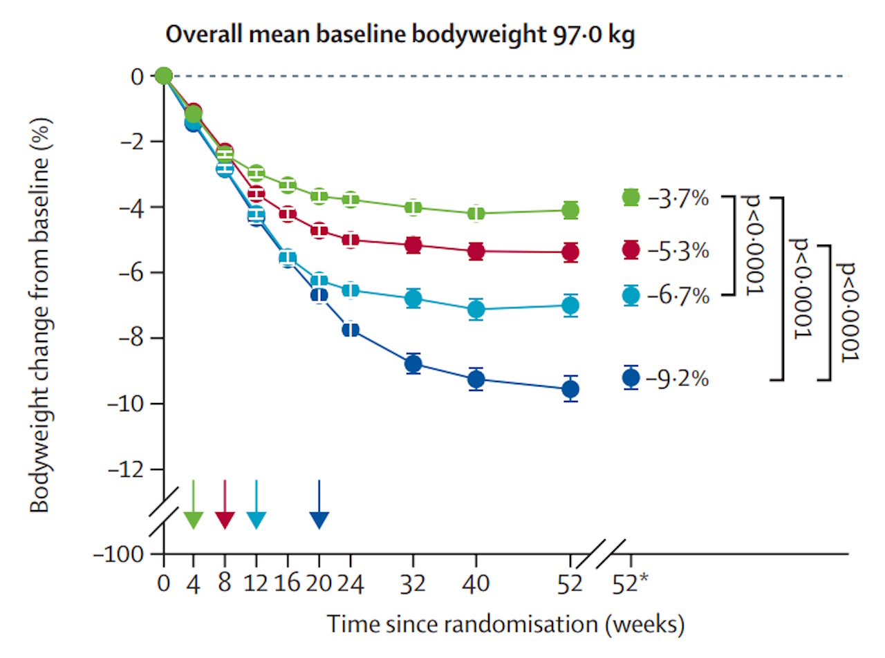 Відсоток втраченої ваги за рік приймання однієї або двох доз семаглутиду (зелений і червоний графіки) та однієї або двох доз орфоґліпрону (блакитний і синій графіки). Rosenstock et al. / The Lancet, 2026