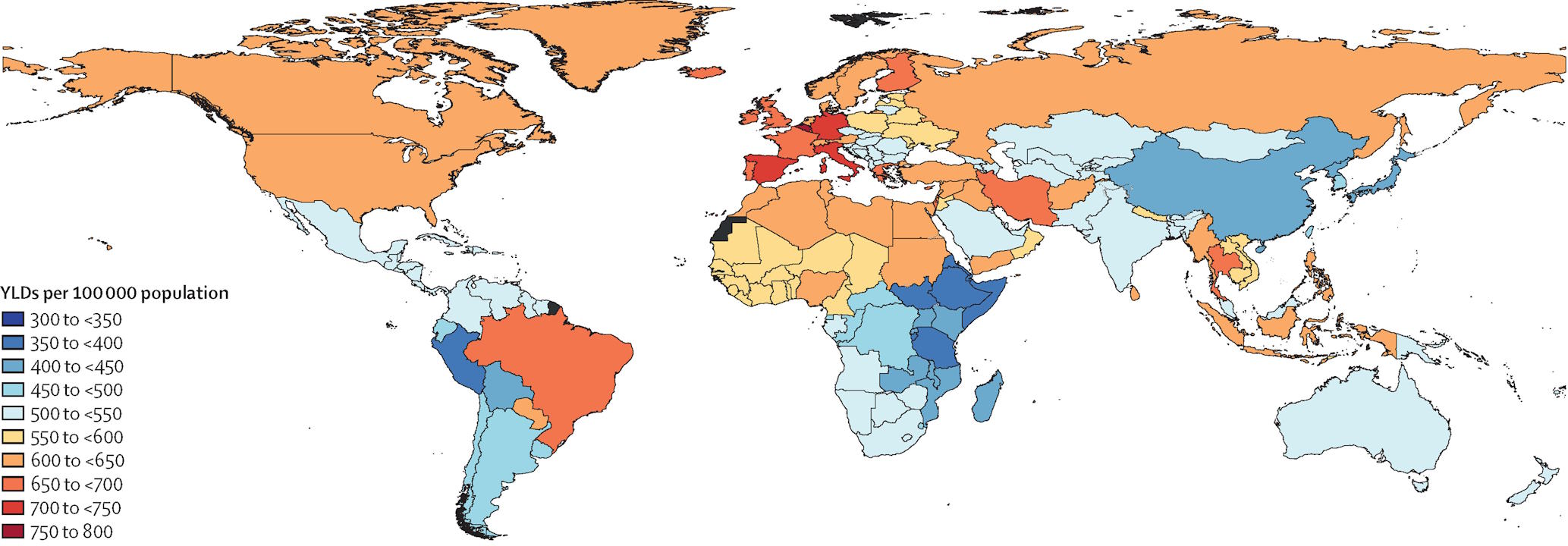 Кількість років, втрачених через пов'язані з головним болем розлади, у різних країнах світу на 100 тисяч населення. Червоним кольором позначено країни, у яких люди найбільше страждали від головного болю, синім — де найменше. Hus⊘y et al. / The Lancet Neurology, 2025