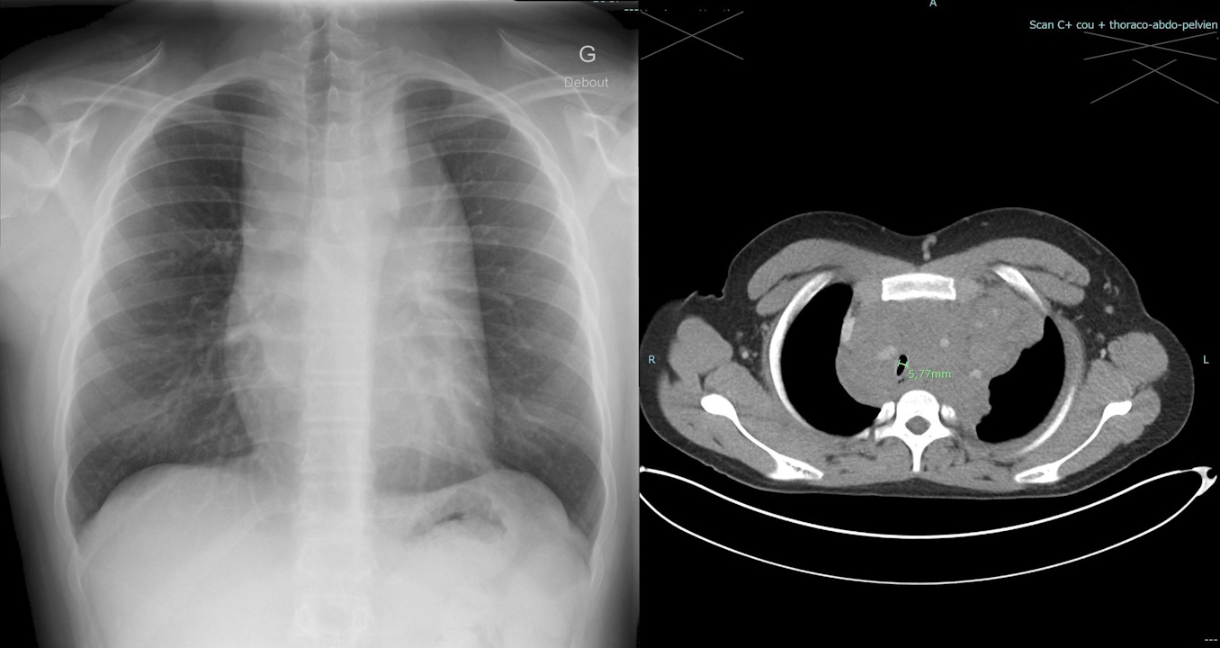 Підліток звернувся до лікарів зі скаргами на сухий кашель і скутість у грудях, які зберігалися протягом місяця, а також утруднення дихання в положенні лежачи, через що він був змушеним спати на двох подушках. Рентген і комп’ютерна томографія грудної клітки вказали на утворення в середостінні — просторі між легенями, згори обмеженому грудною клітиною, а знизу діафрагмою. Це утворення перетискало кровоносні судини, що живлять серце, бронхи та трахею.