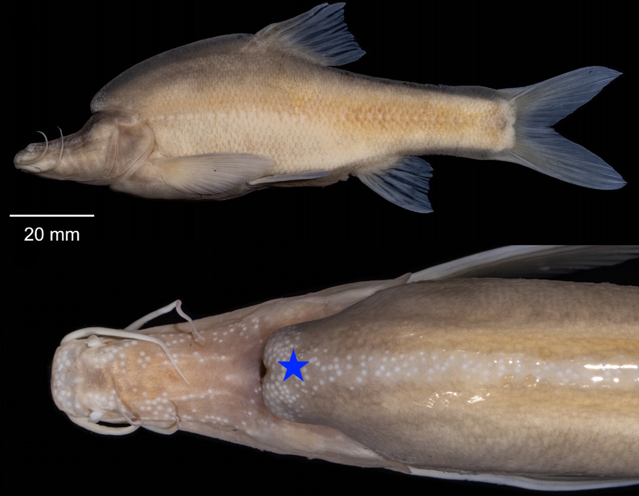 Представник нового виду безоких печерних риб. Синьою зірочкою позначені вирости знизу його голови, що нагадують роги. Liu et al. / Ecology and Evolution, 2025