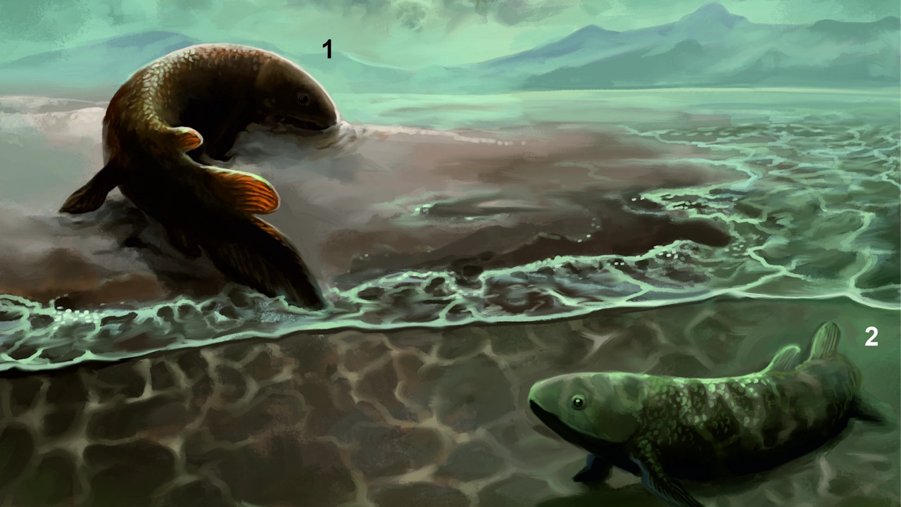 Художнє зображення риби Reptanichnus acutori (1), яка активно повзала по суші, і Broomichnium ujazdensis (2), яка відпочивала, впираючись плавниками у землю. Jakub Zalewski