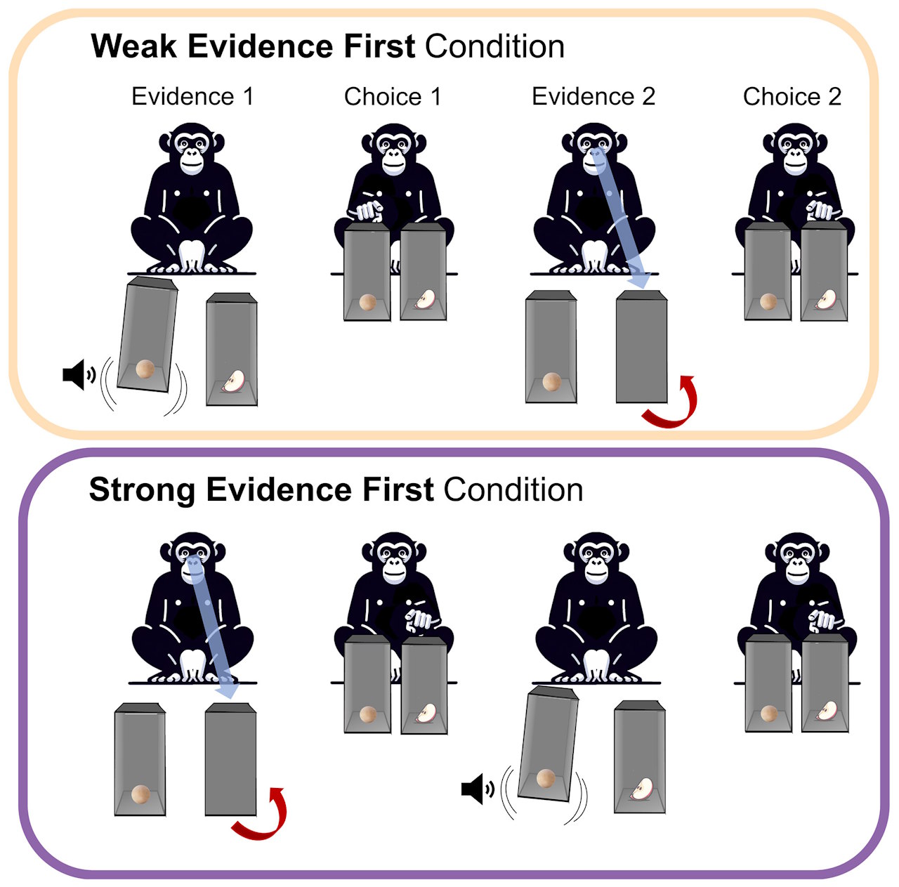 Схематична ілюстрація логічного мислення в шимпанзе: якщо їм спершу показували слабкі докази наявності їжі (звук їжі в коробці), то шимпанзе робили вибір на користь варіанту з сильними доказами (коли бачили їжу в коробці). Натомість слабкі докази не спонукали їх переглянути вже наявні уявлення про розташування їжі в коробках. Schleihauf et al. / Science, 2025