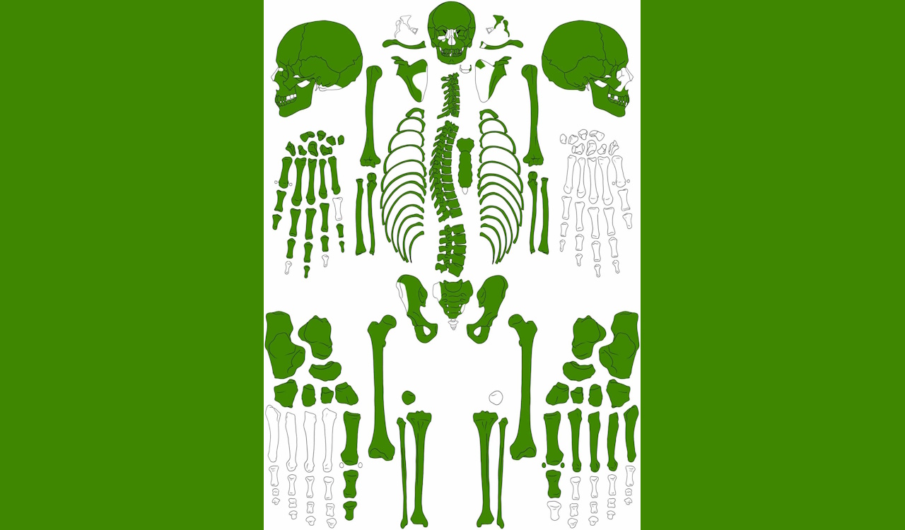 Схема кісток чоловіка, позначені зеленим кістки знайшли в могилі, тоді як білим — ні. Valoriani et al. / International Journal of Paleopathology, 2025