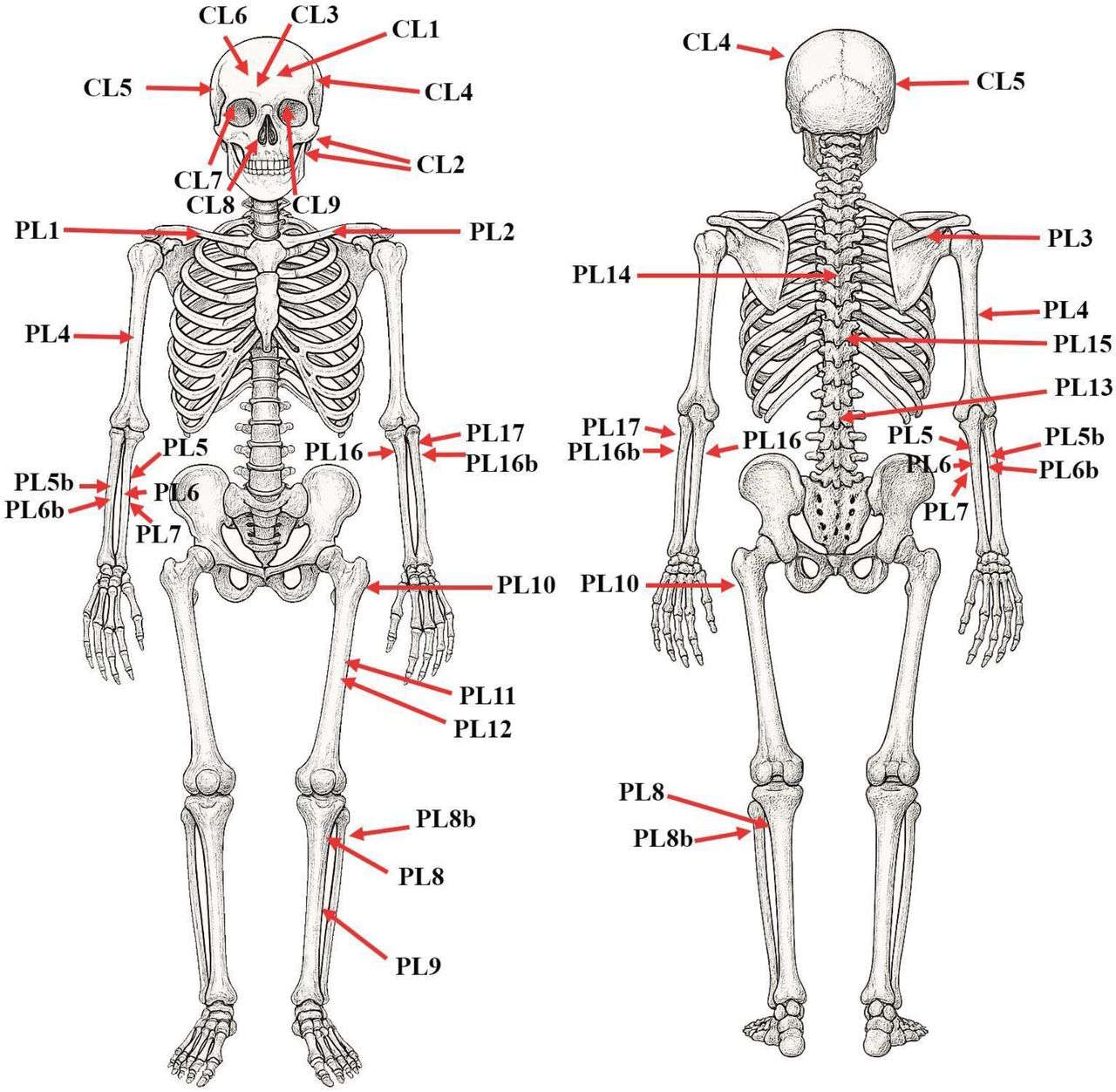 Схема пошкоджень на кістках Бели Ростиславовича. Hajdu et al. / Forensic Science International: Genetics, 2025