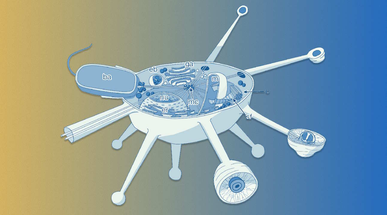 Схема будови клітини сонцеподібного організму Solarion arienae з ядром (nu), мітохондріями (m), і комплексом (mc), який дозволяє відросткам клітини захоплювати здобич, бактерії (ba). Valt et al. / Nature, 2025