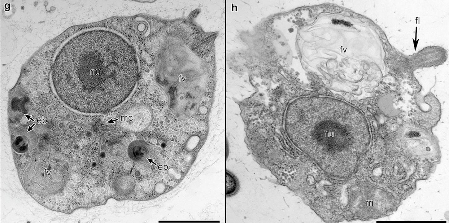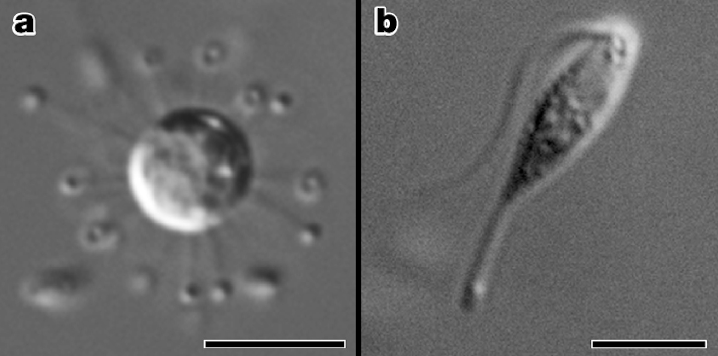 Дві форми клітин Solarion arienae — сонцеподібна (зліва) та зі джгутиком і хвостом (справа). Valt et al. / Nature, 2025