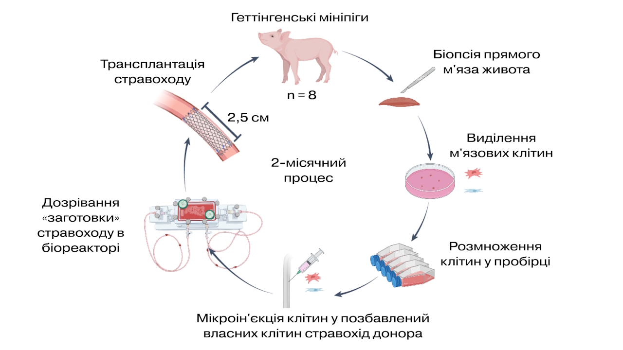 Науковці використали стравоходи від здорових свиней-донорів, які позбавили клітин, щоб залишити лише волокнисту структуру як основу. На поверхню цієї структури пересадили м’язові клітини, які взяли у свиней-реципієнтів і виростили в лабораторії. Заготовку стравоходу помістили в біореактор, де до клітин постійно надходили поживні речовини, тож за тиждень вона перетворилася на готовий до пересадки стравохід із гладкою мускулатурою. Такі стравоходи пересадили вісьмом свиням, які не лише пережили критичні 30 днів після операції, але й змогли самостійно ковтати та доставляти їжу до шлунка. За пів року спостереження у них не виявили суттєвих побічних ефектів, а навколо пересадженого стравоходу виросли нові нерви та судини, які підтримували його роботу.