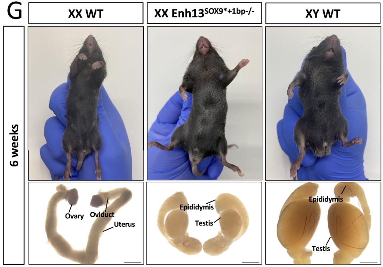Науковці зробили невеликі зміни в послідовності Enh13 — додали один нуклеотид або видалили три. В обох випадках мишенята, які за хромосомним набором були самицями, народжувалися з чоловічими статевими органами. Але в них не було гоноцитів — клітин-попередників сперматозоїдів, для розвитку яких потрібні гени з Y-хромосоми. Досліджуючи активність генів на рівні клітин, науковці з’ясували, що невеликі зміни в послідовності Enh13 не давали специфічним для самиць регуляторним сполукам зв’язуватися з цією послідовністю. У результаті вона запускала каскад активації «чоловічих» генів, відповідальних за розвиток сім’яників.