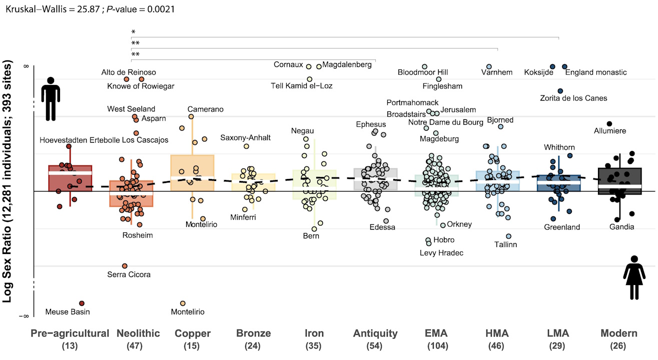 Нерівність між харчуванням чоловіків і жінок також зберігалася протягом усього досліджуваного періоду, але була найбільш вираженою у споживанні білків. У верхніх десяти відсотках споживачів нітрогену в середньому на одну жінку припадало понад двоє чоловіків, а найбільш помітним це було в Середньовіччі. Водночас у нижніх десяти відсотках споживачів нітрогену жінки траплялися в 1,27 раза частіше за чоловіків, особливо протягом неоліту та раннього Середньовіччя.