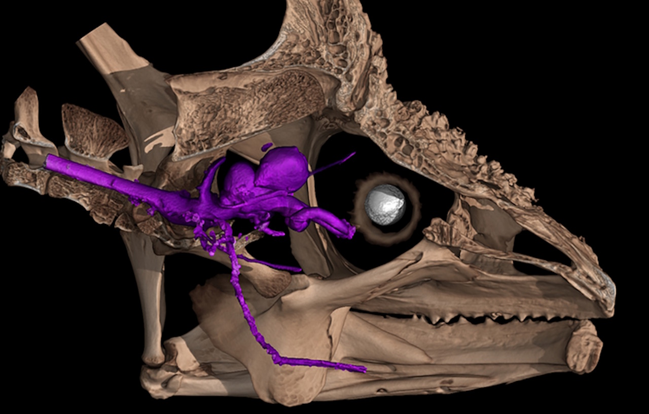 Закручений очний нерв хамелеонів (позначений фіолетовим), який дозволяє їм вільно рухати очима. Collins et al. / Scientific Reports, 2025