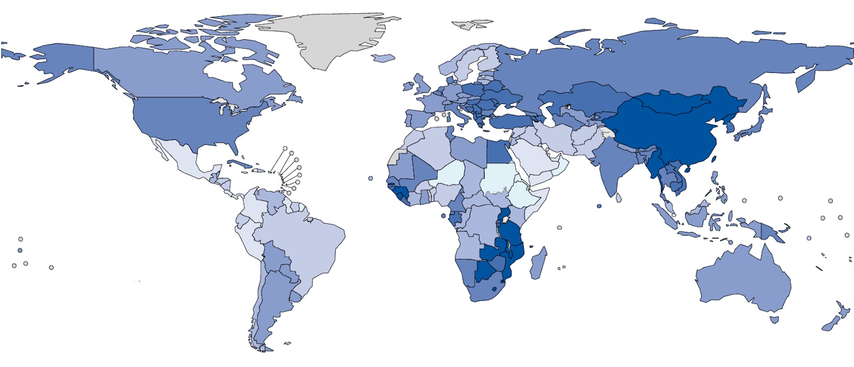 Відсоток випадків раку, яким можна запобігти завдяки зміні способу життя, у кожній країні. Темнішим кольором позначено країни з найвищим відсотком таких випадків. Fink et al. / Nature Medicine, 2026