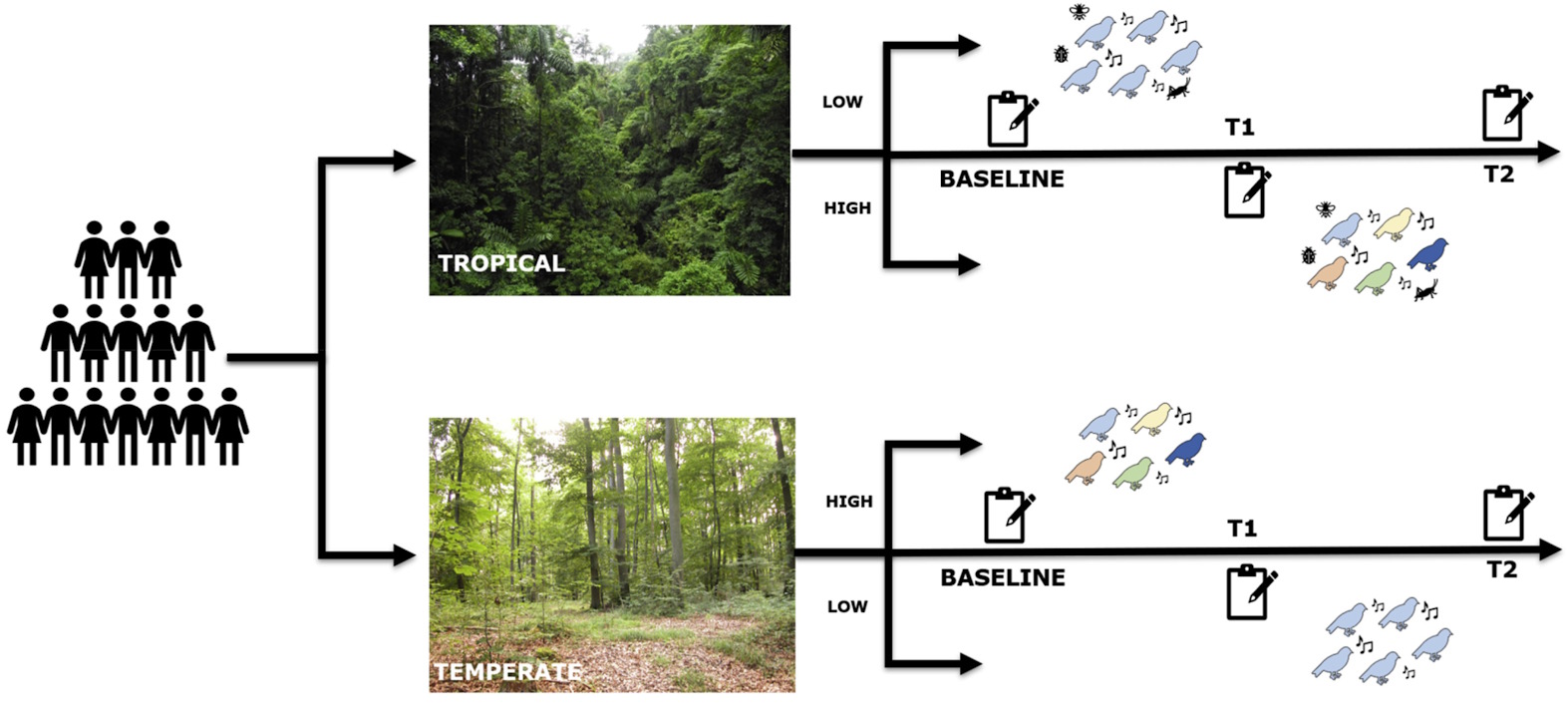 Схема дослідження: кожному учаснику вмикали звук знайомого йому лісу помірних широт і звук тропічних джунглів. В обох випадках запис міг мати високу чи низьку різноманітність звуків тварин. Cuentas Romero et al. / Journal of Environmental Psychology, 2026